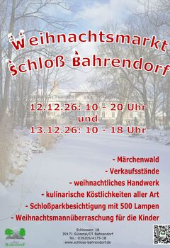 Auch in diesem Jahr wird es wieder einen Weihnachtsmarkt auf Schloß Bahrendorf geben. Am 3. Adventwochenende werden wir wieder das Areal weihnachtlich schmücken und alle Besucher Herzlich Willkommen heißen.