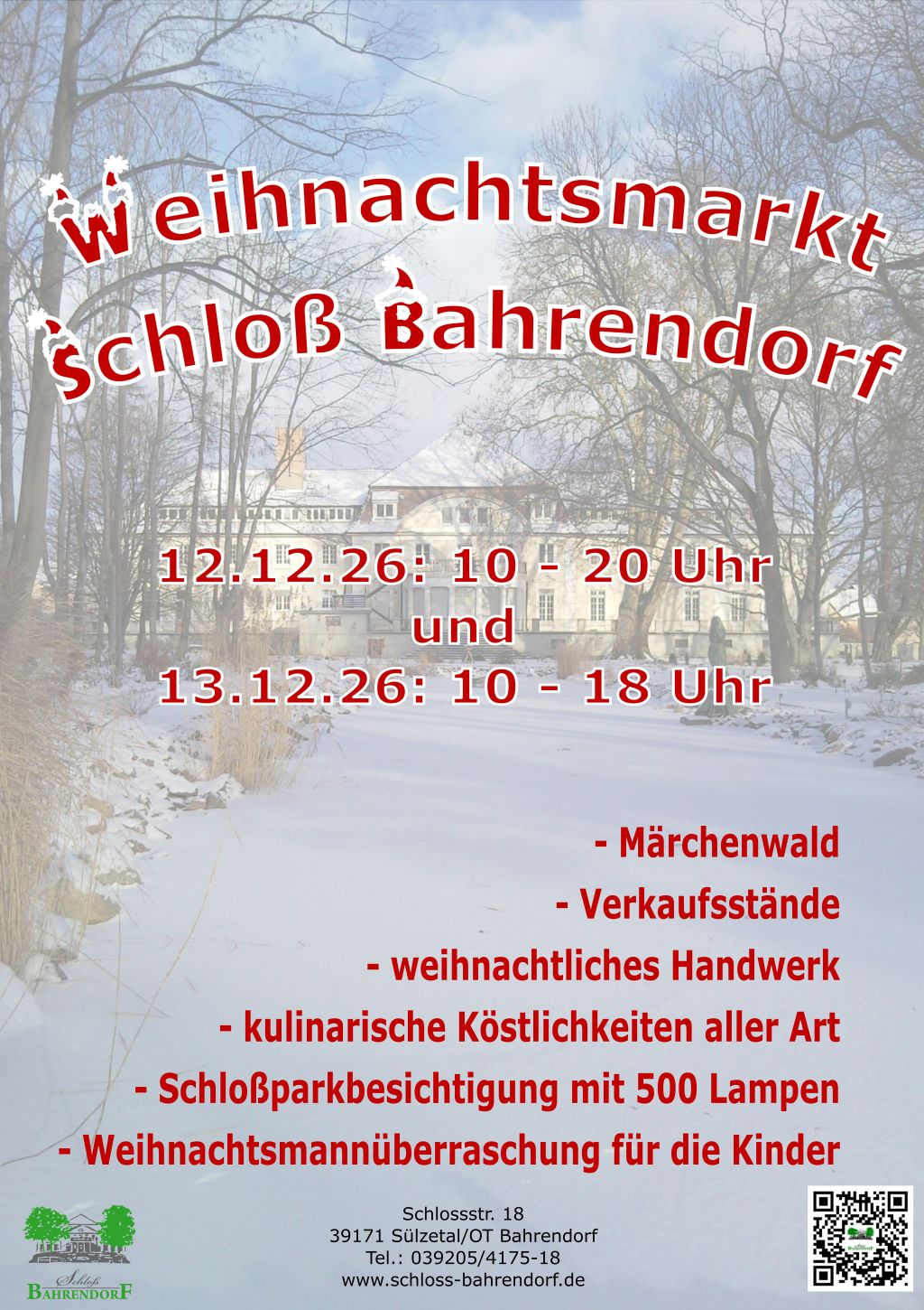 Auch in diesem Jahr wird es wieder einen Weihnachtsmarkt auf Schloß Bahrendorf geben. Am 3. Adventwochenende werden wir wieder das Areal weihnachtlich schmücken und alle Besucher Herzlich Willkommen heißen.